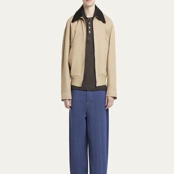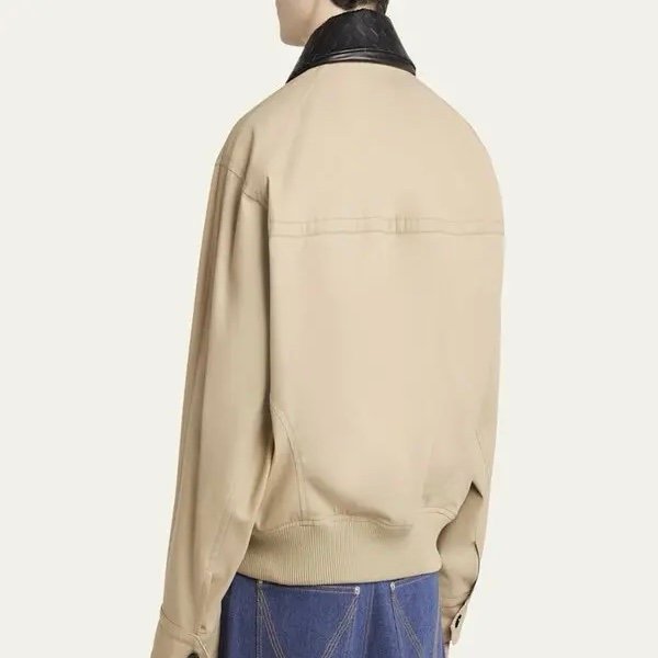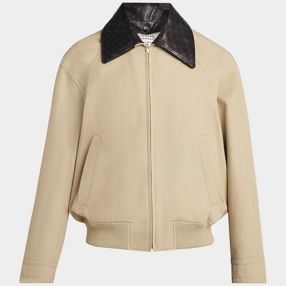 This is a Bottega Veneta men’s cotton twill blouson jacket with an intrecciato leather collar in beige.