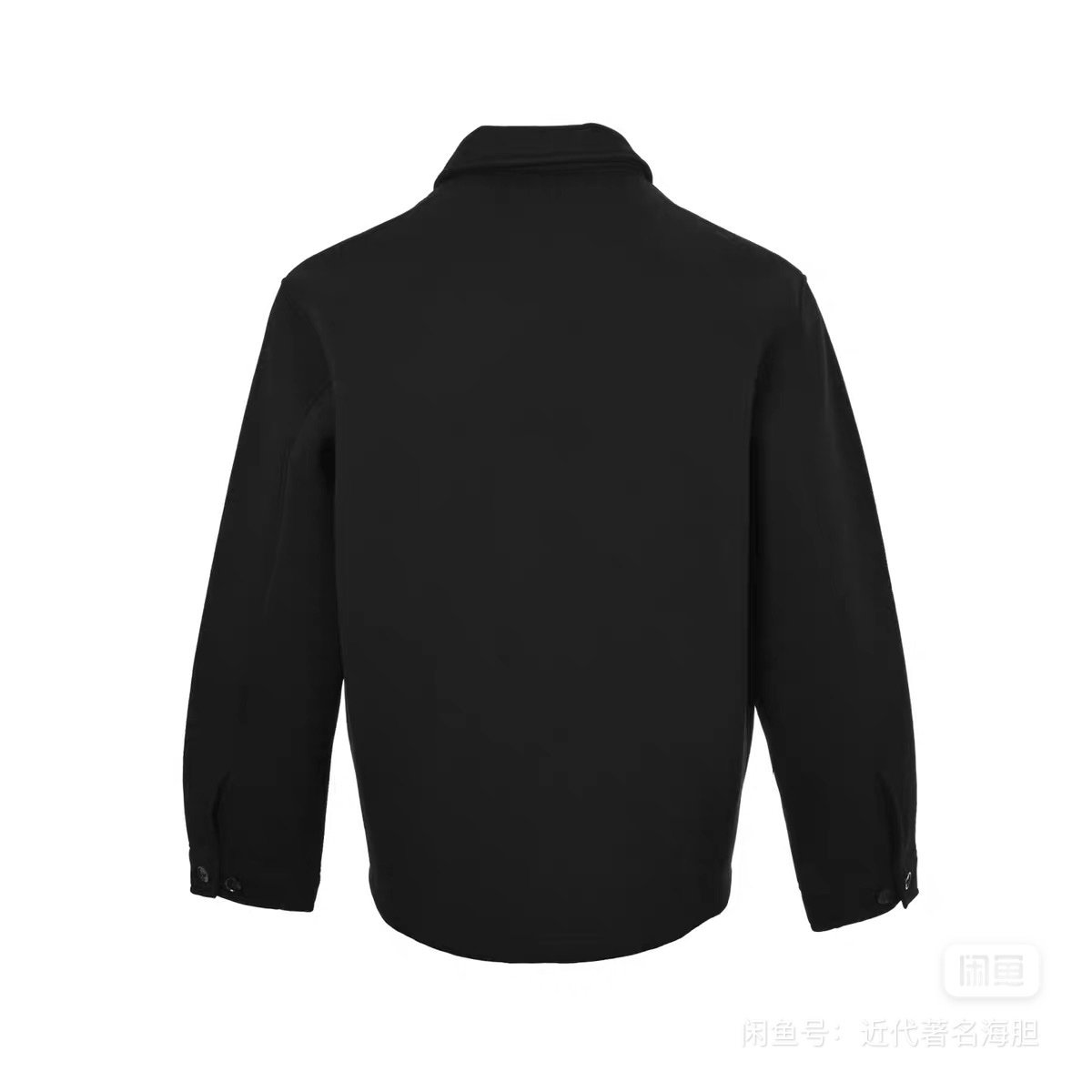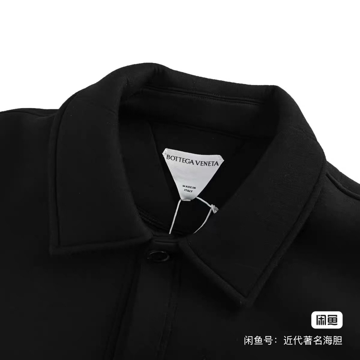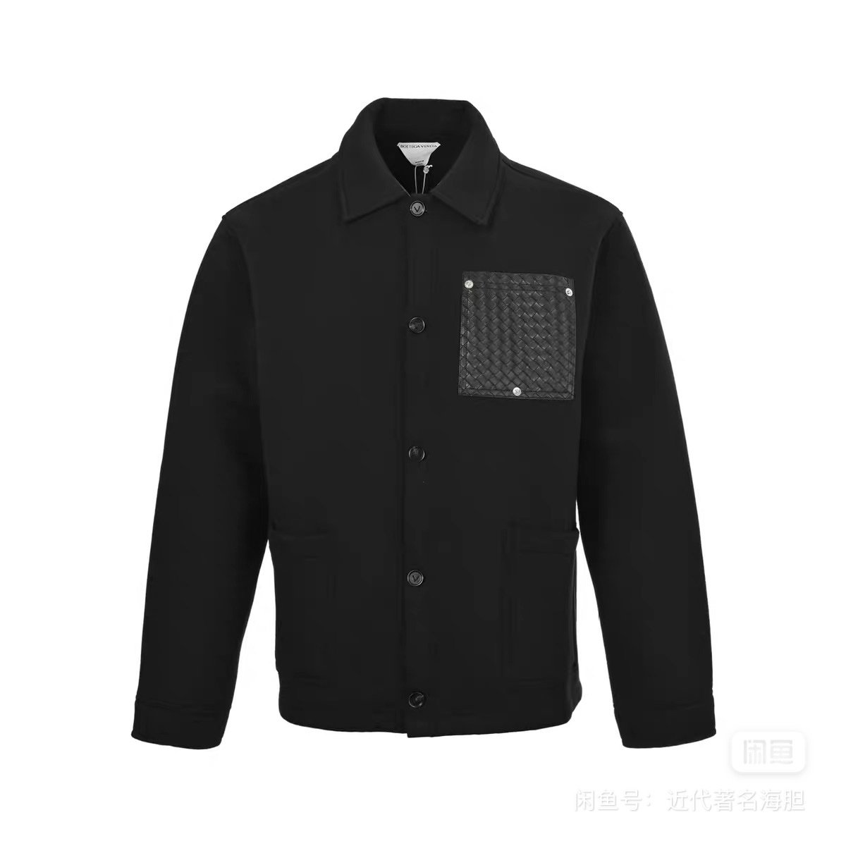 This is a Bottega Workwear jacket in a black wool and cashmere blend with a leather chest pocket.