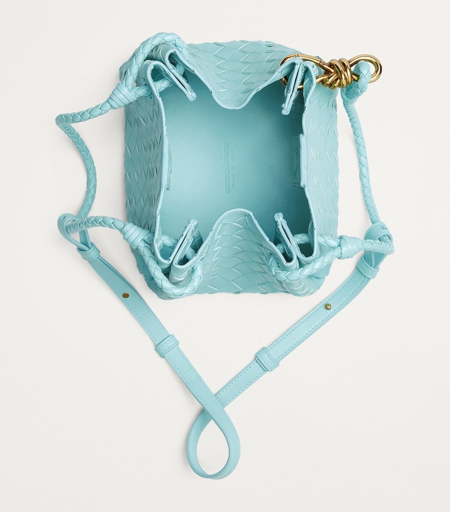 This is a Bottega Veneta Small Parachute bag in woven leather with a detachable shoulder strap and gold-tone knot detail.