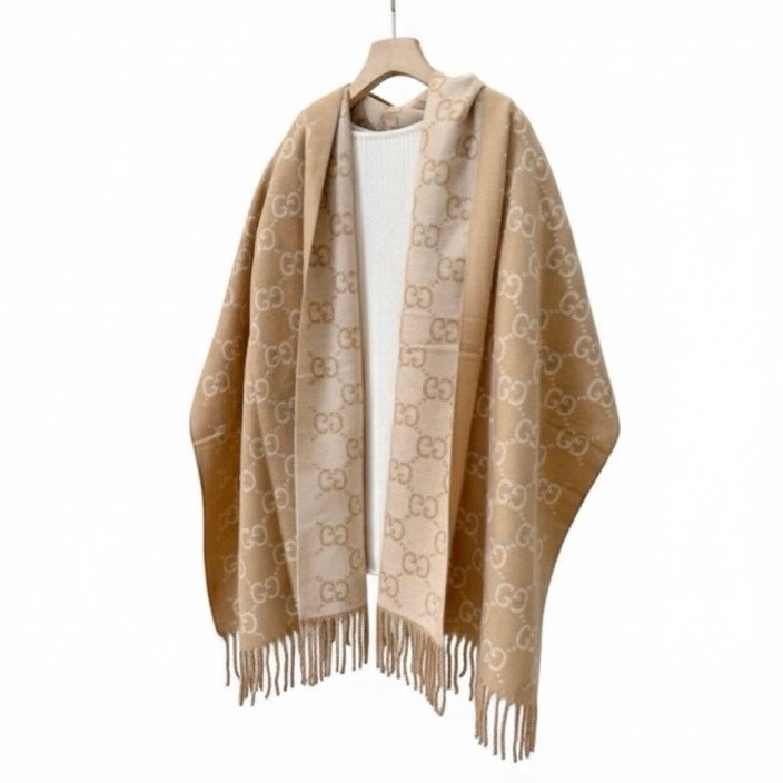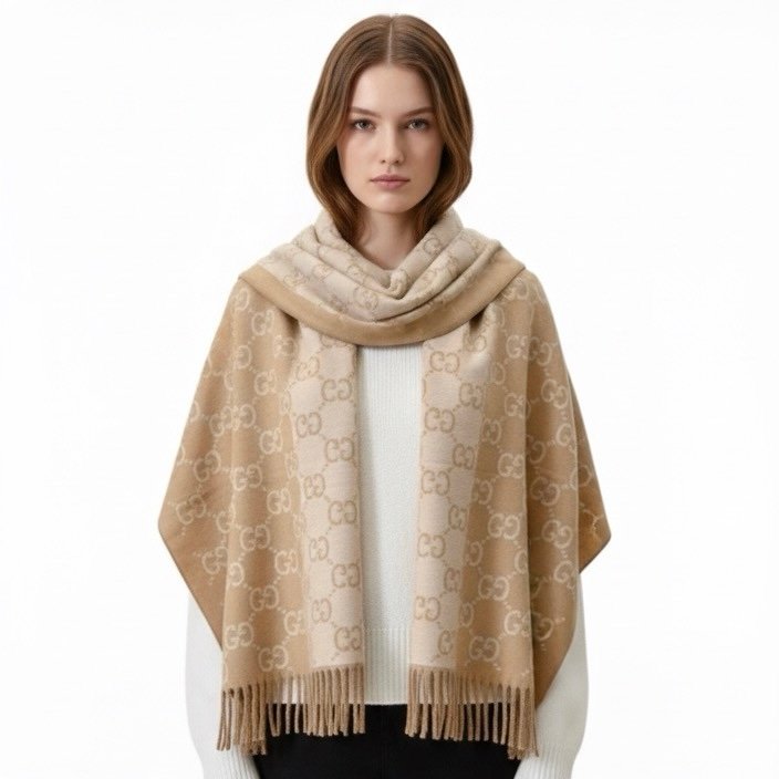 This is a Gucci GG logo scarf in a beige and brown colorway.