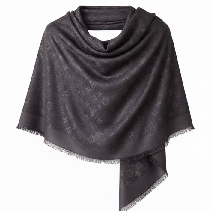 This is a Louis Vuitton Monogram Classic Shawl in a charcoal grey or black color, made from a blend of silk and wool.