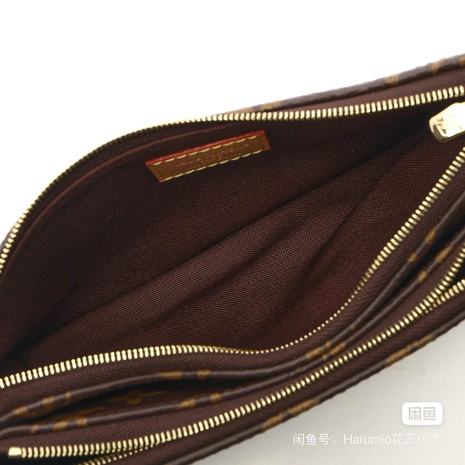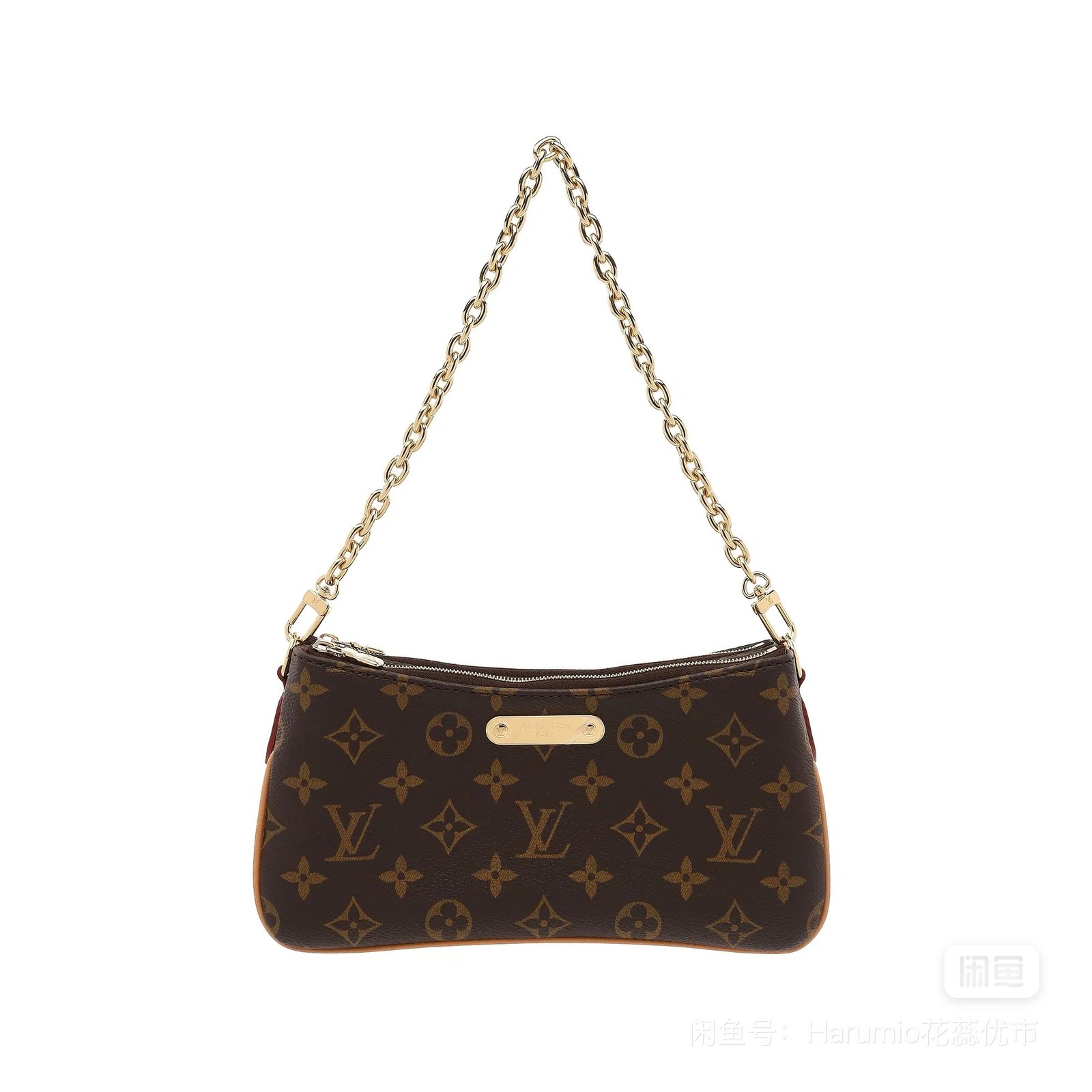 This is a Louis Vuitton Liv Pochette in the classic brown monogram canvas material with gold-tone hardware. It features a double-zipper closure and comes with a detachable gold-tone chain and a removable, adjustable natural cowhide leather strap for multiple styling options.