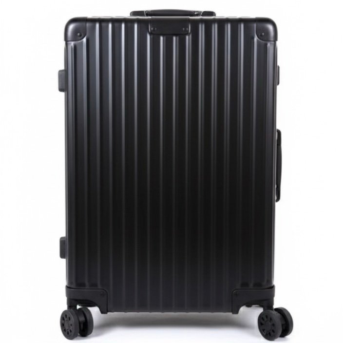 The image displays a Rimowa aluminum suitcase, likely from the