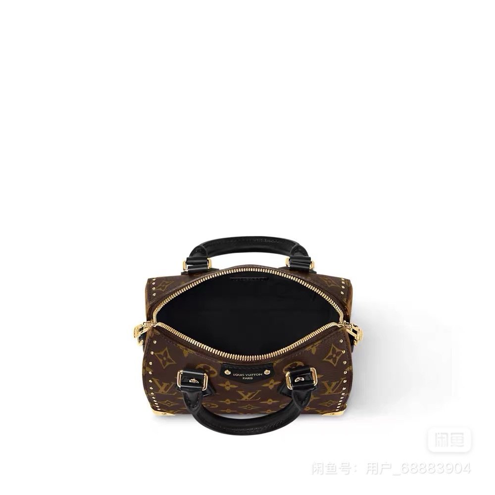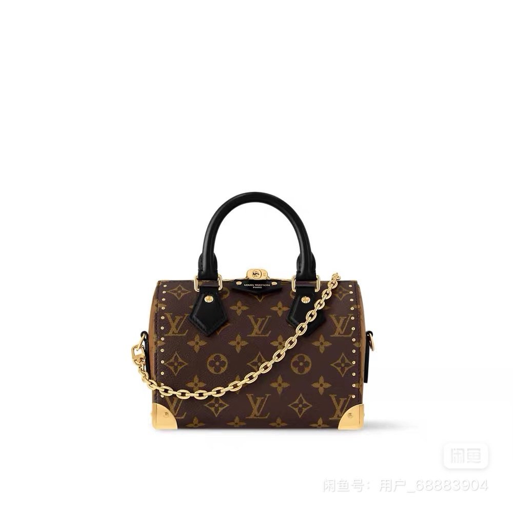 This is a Louis Vuitton Speedy Trunk 20 satchel in Monogram canvas with black leather trim and gold-tone hardware.