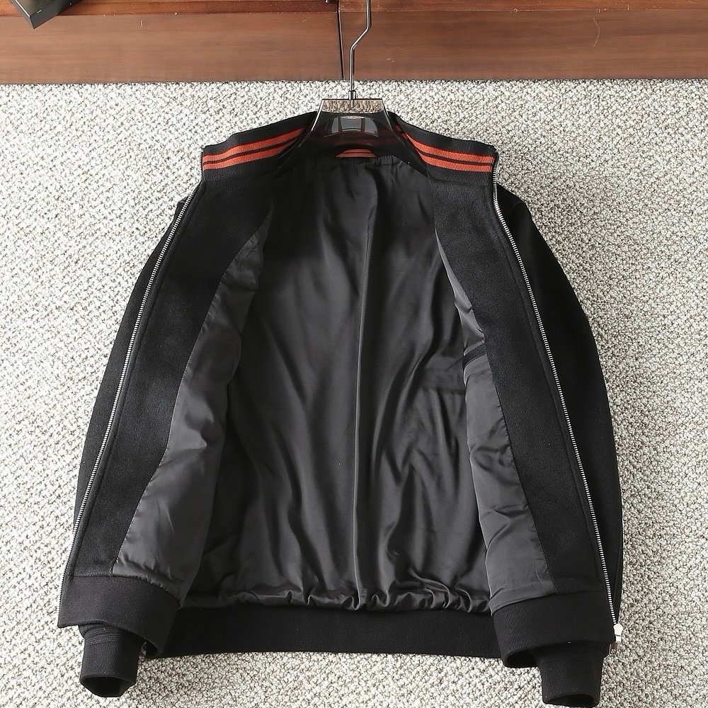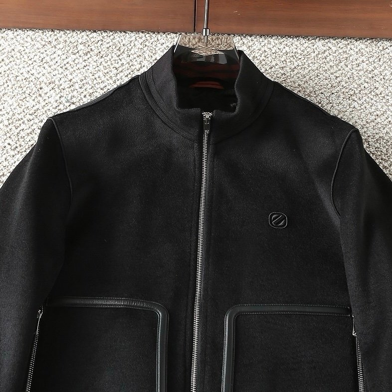 This is a black bomber jacket with contrasting pockets and a small logo on the chest.
